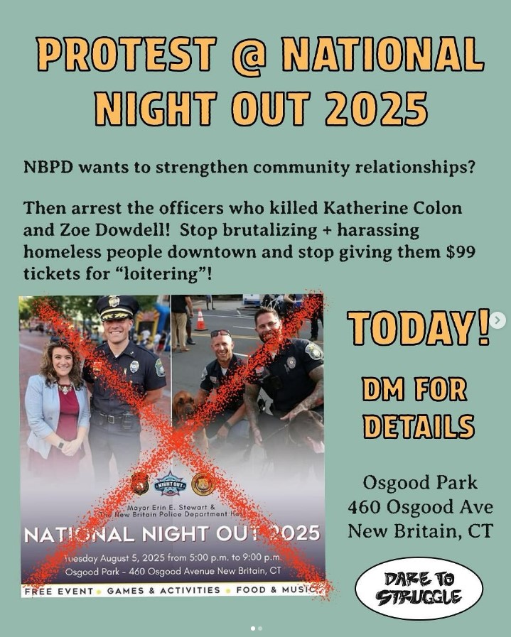 The group has said online that, “Three Dare to Struggle CT members were arrested to stop us from protesting a ‘National Night Out’ copaganda cookout.” In a statement, the group said that two activists were arrested, “within an hour of the start time of the ‘National Night Out’ event sponsored by the NBPD, which we had posted plans to protest.”