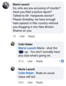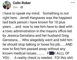 In an online post, a person identified as “Colin Rober”, allegedly a name Ald Smedley uses online, appeared to allege that a member of the Mayor’s office staff, her husband and others were were at fault for the passing of Ald Hargraves.